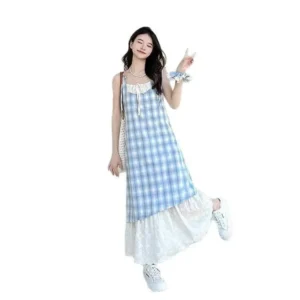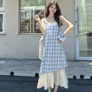 Summer 2025 New Style Women's Lace Splicing Plaid Strap Dress Loose Fit Slimming Midi Dress Fresh And Breathable GownSummer 2025 New Style Women’s Lace...